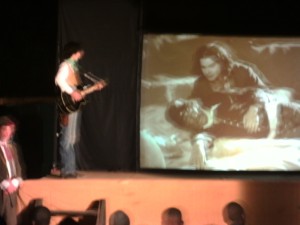 Pour sa participation à cette 3e édition du festival « Rendez-vous chez nous », la compagnie Annibal et ses éléphants a créé une véritable sensation : jouer en temps réel dans un film, face au public. Cette prouesse scénique est, l’on le remarque très bien, le fruit d’âpres efforts qui aboutissent à une belle originalité. En effet, ce projet artistique emmène les acteurs eux-mêmes à réaliser in situ la bande-son, les dialogues et tous les autres effets sonores d’un film western muet. Ainsi, s’instaure une complicité scène-public qui ne fait que produire des effets assez coordonnés pour la soirée et ce, entre différentes séquences du film. Comme un match de football, en quatre vingt dix minutes, les spectateurs sont amenés à jouer une cavalerie,un