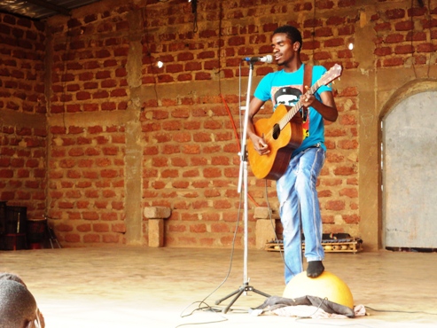 Patrick, c’est ce jeune homme qui à l’aide de sa guitare et d’une calebasse est capable de tenir une foule en haleine de longue minutes durant, comme ici au Centre Kombi du conteur KPG à Arbollé. *Les jeunes de ce village ont été émerveillés par les talents du jeune chanteur et n’ont pas hésité à danser aux rythmes de ses instruments ou à reprendre les paroles mélodieuses de ses refrains.
