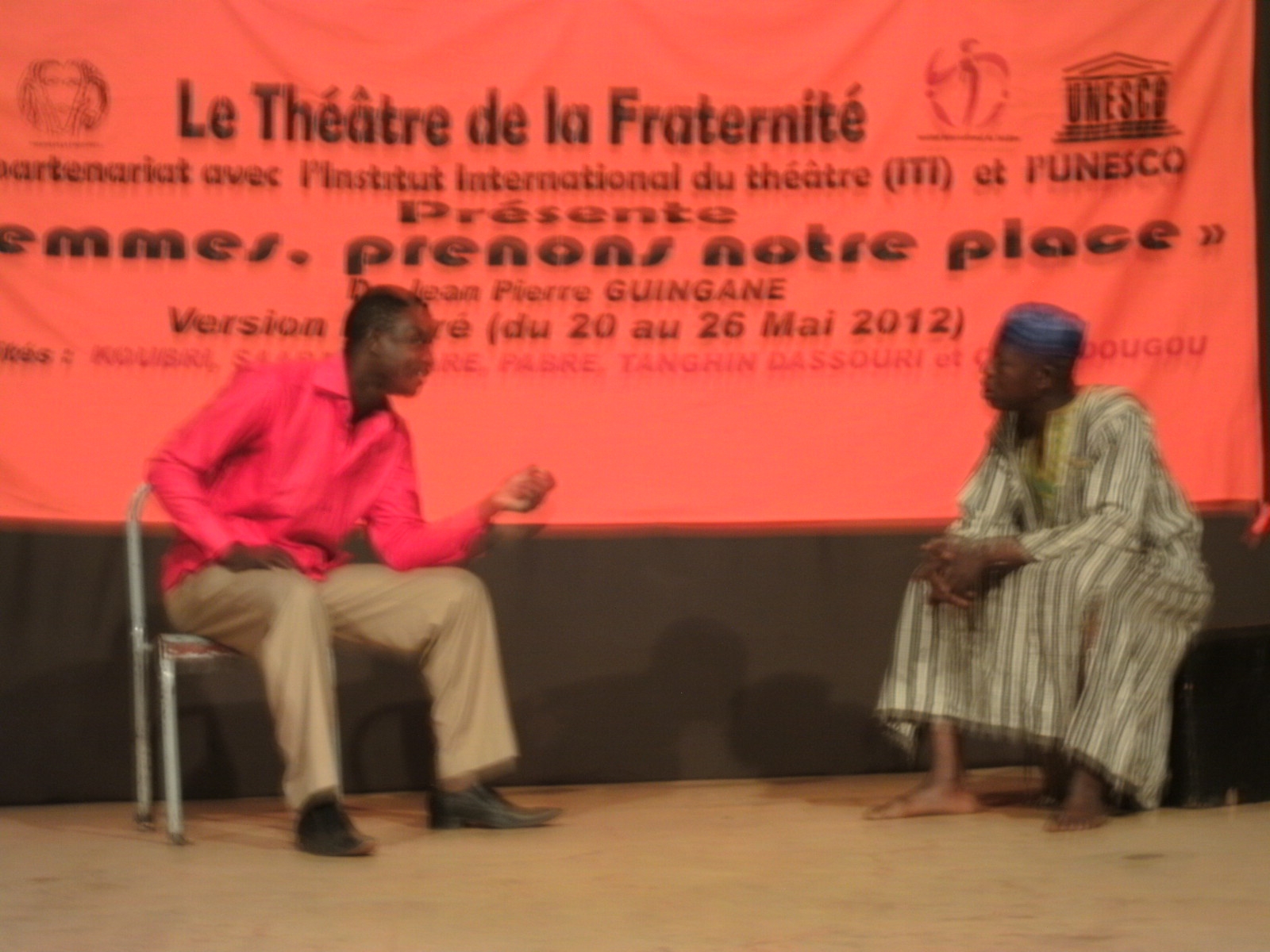 Jouée en langue mooré, Femmes, prenons notre place est un véritable plaidoyer pour la prise en compte des femmes dans les différents combats politiques du Monde. Du 20 au 26 mai, les acteurs sur scène, ont visité les localités de Koubri, Saaba, Pabré, Tanghin-Dassouri et bien sûr Ouagadougou. Né du partenariat entre le Théâtre de la Fraternité, l’Institut International de Théâtre et l’UNESCO, Femmes, prenons notre place, comme de nombreuses autres productions dans le domaine, est née de la plume de feu le Professeur Jean-Pierre GUINGANE qui a utilisé le Théâtre pour contribuer au développement de son pays.