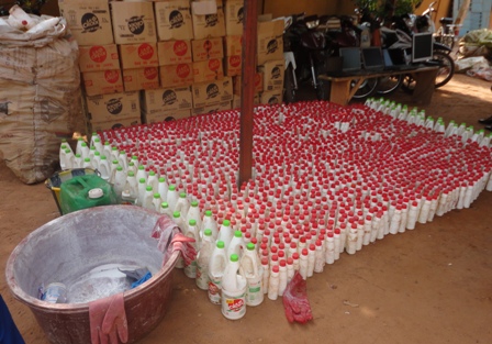 La brigade de recherche de gendarmerie de Ouagadougou a présenté à la presse, ce vendredi 3 août 2012, deux groupes de malfrats et leurs butin, dont un important lots de bouteilles d’eau de javel de production artisanale. La saisie de ces produits de contrefaçon est intervenue le 13 juillet grâce à une collaboration entre l’équipe d’enquêteurs de la gendarmerie et une équipe de la direction générale de la qualité et de la métrologie du ministère du commerce.