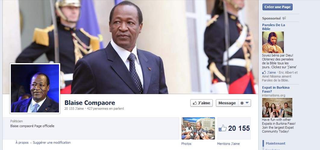Récemment négligés, les réseaux sociaux sont de plus en plus prisés par les hommes et femmes politiques burkinabè, à commencer par le premier d’entre tous, le président du Faso Blaise Compaoré. L’histoire a commencé aux lendemains des élections de 2010 où le chef de la magistrature suprême a lancé un site web. Une page Facebook est ensuite née (2 février 2011) au nom du Président du Faso. Cette page, qui totalise aujourd’hui plus de 20 000 fans, parle uniquement des activités officielles du Président du Faso (visites, voyages, audiences, etc.)