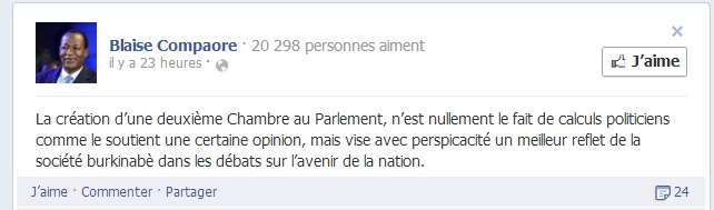 Le Président du Faso, Blaise Compaoré (si c’est vraiment lui), a donné sur sa Page Facebook le 18 juin 2013 à 14h30 (au moment où les Maliens s’apprêtaient à signer leur accord), son avis sur la création du Sénat que l’opposition compte contester lors d’une marche nationale le 29 juin prochain.