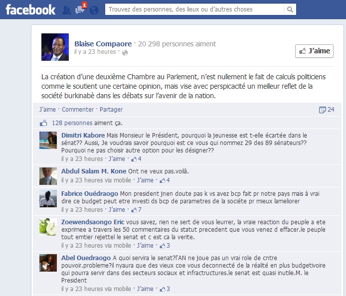 Vu sur Facebook : 119 internautes disent non au Sénat sur la page du Président Compaoré