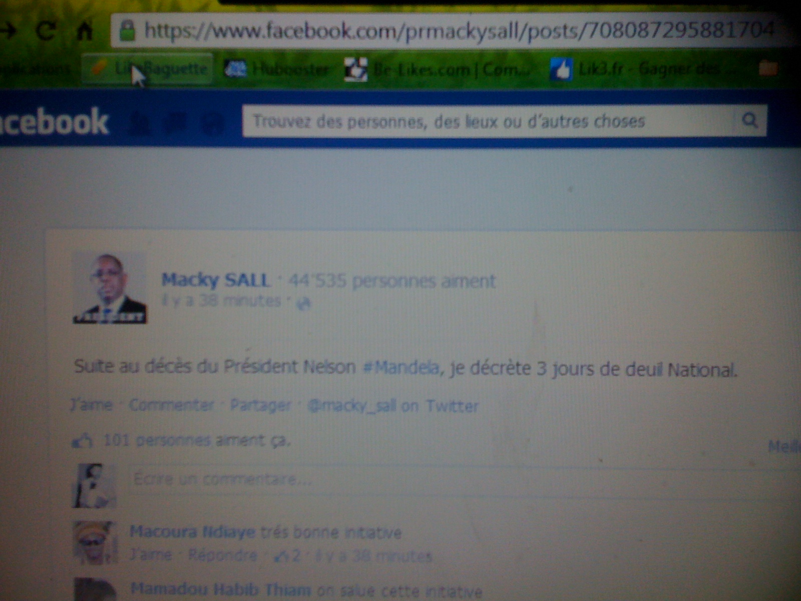 C’est sur sa page Facebook que le Président Sénégalais en a fait l’annonce qui semblait déjà attendue dans la mesure où à l’annonce du décès de Madiba, le Ministre en charge de la bonne gouvernance et porte parole du gouvernement , avait déjà annoncé que le Sénégal allait rendre un hommage à la hauteur de l’homme.