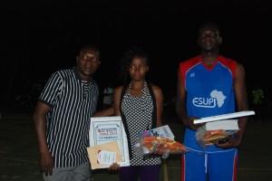 l’ESUP jeunesse et l’UFR SVT (de droite à gauche) ont reçu des lots de consolation de la part du promoteur Abraham Bayili dit crocheto (gauche) Pari tenu pour la première édition du Championnat universitaire de basket ball (CUBA). Cette compétition initiée par le journaliste Abraham Bayili a rendu son verdict le vendredi 18 avril 2014 sur le plateau du lycée Marien N’Gouabi.