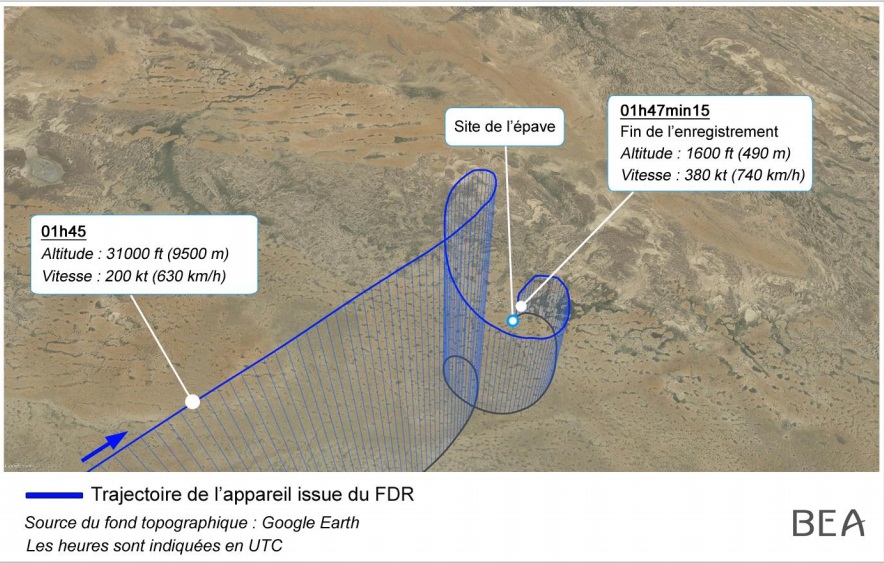 - Puis l’avion part en virage à gauche et perd rapidement de l’altitude, avec des changements d’inclinaison et d’assiette très importants. La rotation vers la gauche continue jusqu’à la fin de l’enregistrement. Le dernier point enregistré, à 1h47mn15s correspond à une altitude de 1600ft, une vitesse de 380kt environ et une vitesse de descente extrêmement importante.