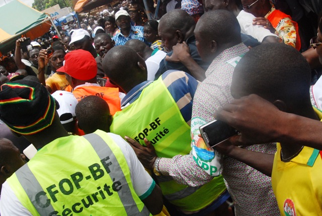 Pendant le discours de Zéphirin Diabré, un incident. Un inconnu est en effet monté sur le podium et a arraché le micro des mains du Chef de file. Il a pu juste dire « attendez je vais dire la vérité », avant d’être maîtrisé par le service de sécurité du CFOP et d’être extrait du lieu de la manifestation.