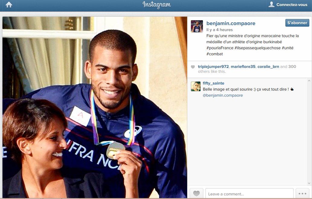 « Fier qu’une ministre d’origine marocaine touche la médaille d’un athlète d’origine burkinabé ». C’est le message que l’athlète franco-burkinabè Benjamin Compaoré a écrit sur ses différents réseaux sociaux (Instagram, Facebook, twitter) le 8 septembre 2014 après la réception des médaillés français par les autorités.
