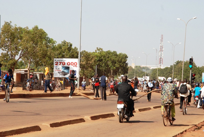 Plusieurs voies de la ville ont été barrées avec des objets divers, et surtout des pneus auxquels il est mis parfois le feu. Des jeunes parcourent à pied, à moto ou à vélo ces artères en sifflant et en criant « non au référendum » ou encore « Blaise Compaoré, trop c’est trop ».