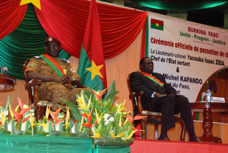 Six Chefs d’Etat de l’Union africaine (UA), de la CEDEAO (John Dramani du Ghana, Ibrahim Boubacar Kéita du Mali, Mohamed Ould Abdel Aziz de la Mauritanie, Macky Sall du Sénégal, Mamadou Issoufou du Niger et Yayi Boni du Bénin) et les émissaires de l’ONU, le corps diplomatique, les gouverneurs de région, la société civile, les partis politiques ont été témoins de la passation des charges de Chef d’Etat entre le lieutenant-colonel Isaac Zida et Michel Kafando.