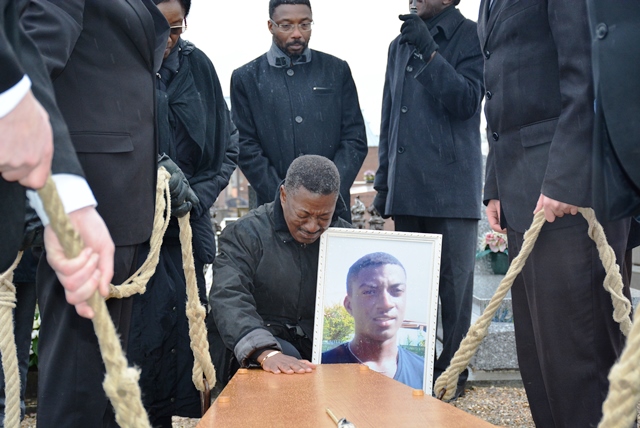 A l’issue de la prière au cours de laquelle l’âme du défunt a été confiée au Seigneur afin qu’il repose à jamais dans l’espérance du Christ, vient le moment des adieux. Kadiatou, la grand-mère de Rivel, directement venue de l’aéroport en provenance du Burkina, est inconsolable. Elle étreint le cercueil, mais doit se résoudre à se séparer à jamais de son petit-fils.