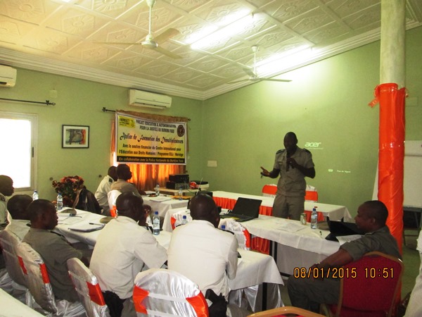 « Nous avons initié le projet en tenant compte du thème qui intéresse la police nationale, à savoir les principes généraux des droits humains et du droit international, la prévention de la torture à l’égard des personnes gardées à vue, le respect et la protection des droit humains par rapport au maintien de l’ordre public », a dit M. Ouédraogo.
