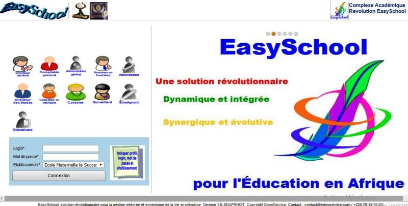« Easy school » (école facile en français) est un programme informatique qui permet d’optimiser la gestion des établissements d’enseignement. La plateforme a été conçue par Equo Service (le service de l’espoir), une société en ingénierie spécialisée en informatique innovante et dans les prestations offshore.