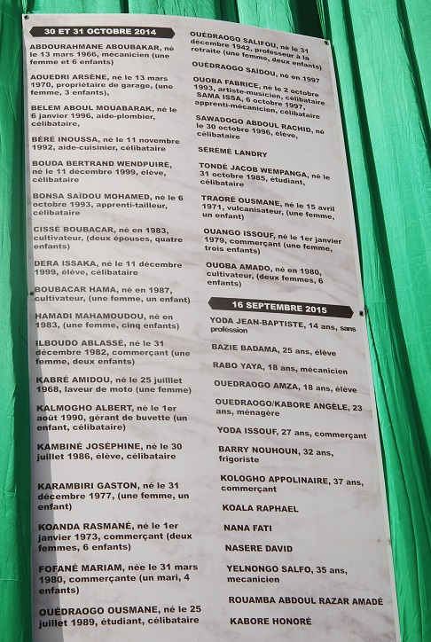 Chevaliers. Les 14 martyrs ont été ensuite élevés au rang de Chevaliers de l’ordre national à titre posthume par le Président du Faso Michel Kafando, suivi de la sonnerie aux morts. La stèle, dont la première pierre a été posée le 30 mai, a été inaugurée. Les noms des martyrs seront gravés sur le granit qui provient de Laongo.