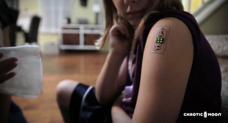 « Chaotic Moon » a conçu un prototype de tatouage élaboré à l’aide d’une encre conductrice et relié à une puce permettant de collecter des informations biométriques et de l’environnement direct dans lequel son porteur se trouve.