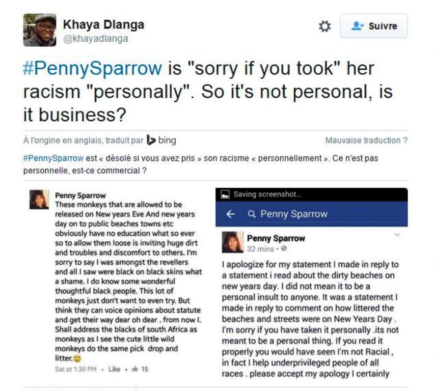 Devant le tollé provoqué par ses propos sur les réseaux sociaux, Penny Sparrow a effacé son commentaire et présenté des excuses, affirmant que son « intention n’était pas d’insulter personnellement quiconque ».