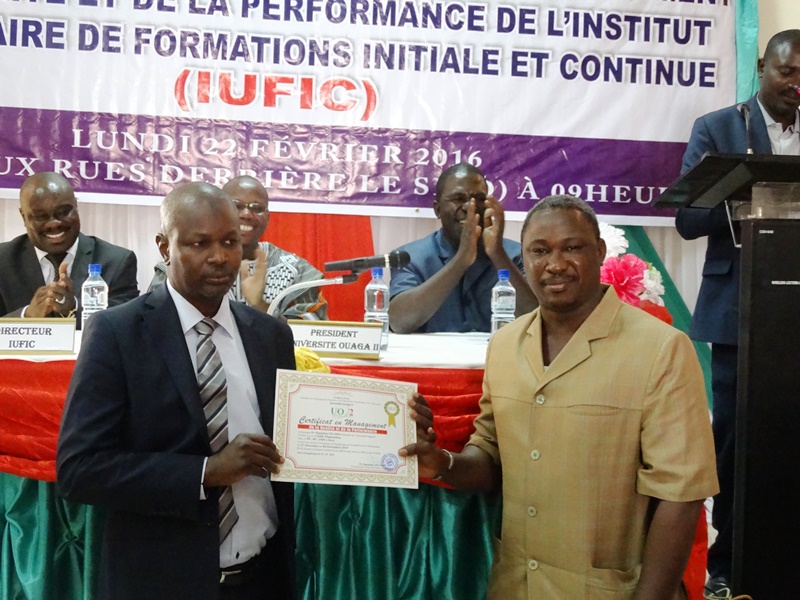L’Institut universitaire de formations initiale et continue (IUFIC) de l’université Ouaga II a remis ce lundi 22 février 2016 à douze membres de la 2ème promotion formés en management de la qualité et la performance leur parchemin de fin de formation.