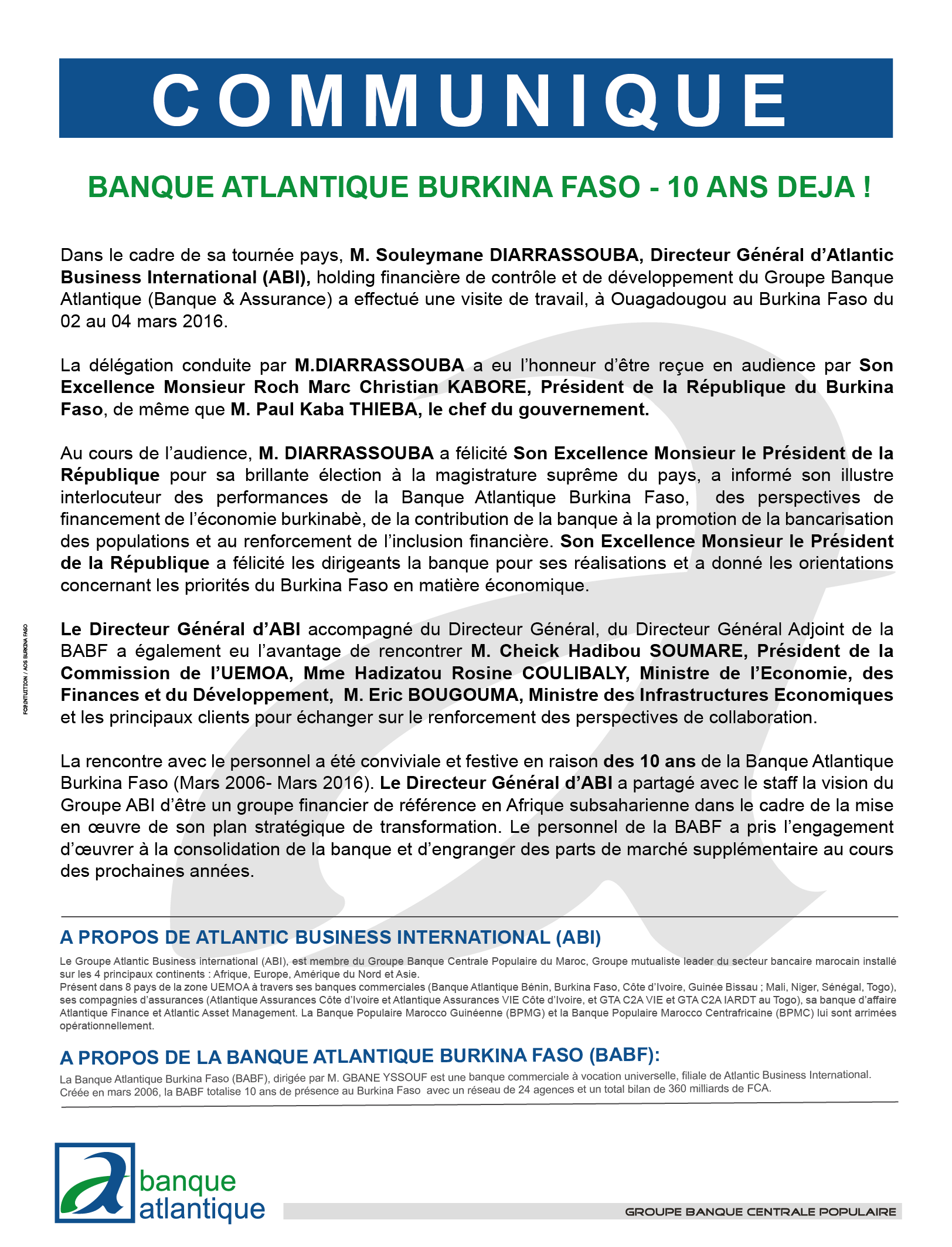 Accueil/Actualité/communiqués de presse/BANQUE ATLANTIQUE BURKINA FASO – 10 ANS DEJA ! BANQUE ATLANTIQUE BURKINA FASO – 10 ANS DEJA ! Webmaster B24 Envoyer un courriel 15/03/20160 Moins d’une minute Partage Webmaster B24 Envoyer un courriel 15/03/20160 Moins d’une minute Linkedin Messenger Messenger WhatsApp Telegram Partager par email Imprimer