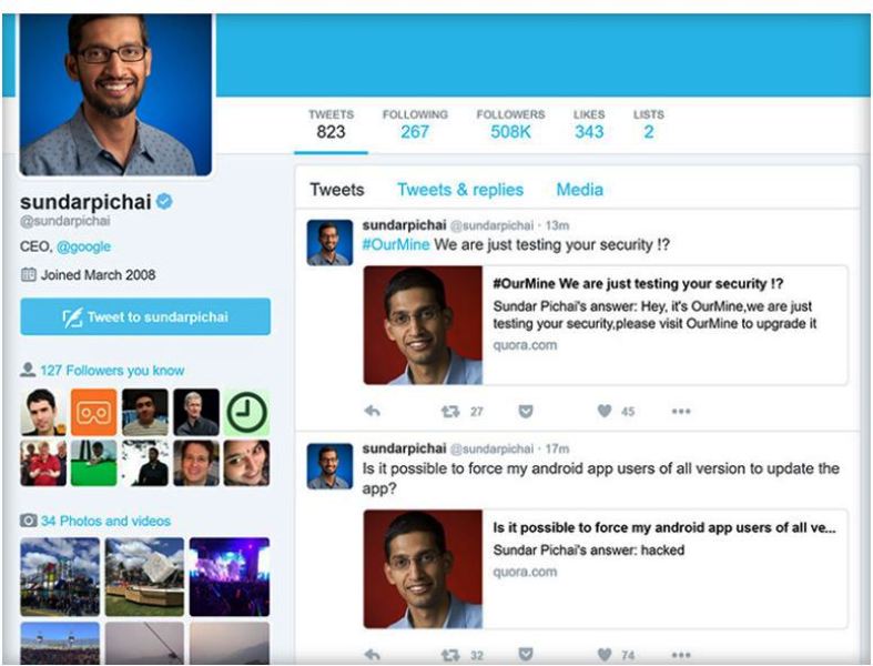 L’équipe de « hacker OurMine » a encore frappé et a piraté le compte Twitter du PDG de Google via une faille dans l’application tierce Quora.