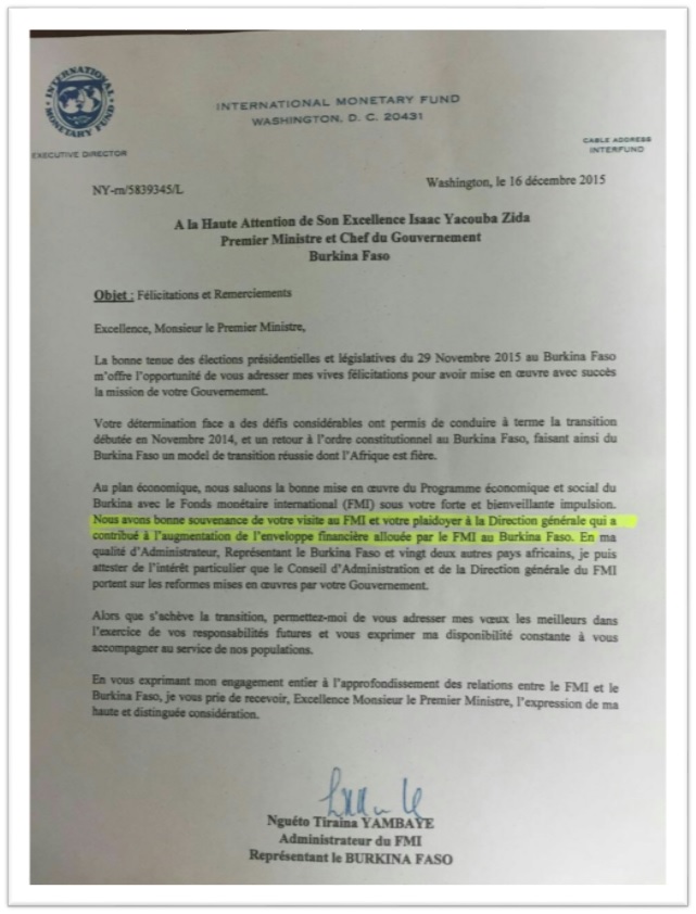 Monsieur Yogo, dans cette lettre de félicitations du Fonds Monétaire International (FMI), adressée à l’ex Premier Ministre Yacouba Isaac Zida, (ci-joint à cet écrit) il est dit clairement ceci : « … au plan économique, nous saluons la bonne mise en œuvre du Programme économique et social du Burkina avec le Fonds Monétaire International (FMI), sous votre forte et bienveillante impulsion. Nous avons bonne souvenance de votre visite au FMI et votre plaidoyer à la Direction générale, qui a contribué à l’augmentation de l’enveloppe financière allouée par le FMI au Burkina Faso… ».
