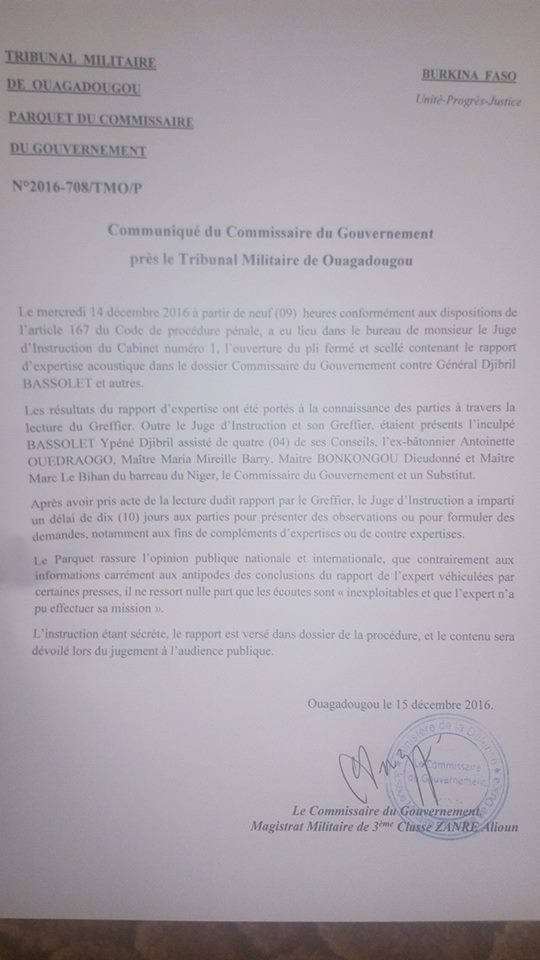 Le général Djibrill Bassolé a été auditionné le 14 décembre 2016 par le tribunal militaire afin de lui communiquer les résultats de l’expertise sur les écoutes téléphoniques entre lui et Guillaume Soro  lors du putsch du 16 septembre 2015. Dans un communiqué, le parquet du tribunal militaire indique que l’expert allemand a conclu que ces écoutes sont exploitables et qu’il a pu mener son travail à terme.
