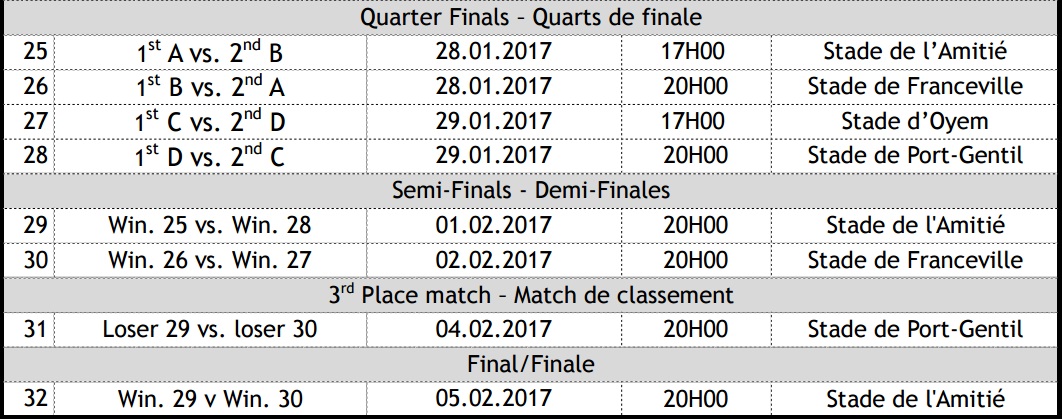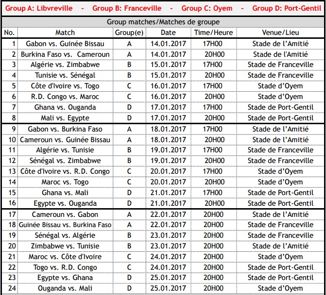 La Coupe d’Afrique des Nations (CAN) Gabon 2017 aura lieu du 14 janvier au 5 février 2017. Voici le calendrier des matchs à l’heure du Gabon (GMT +1 ).