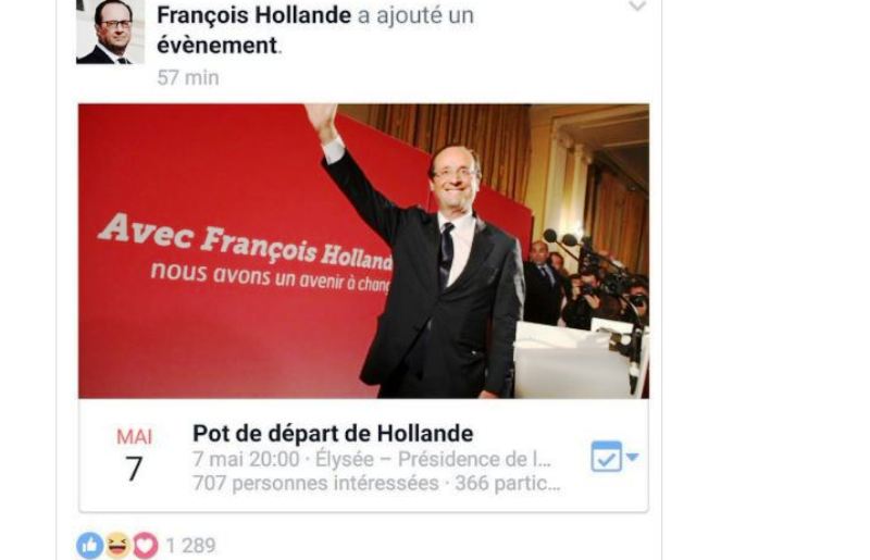 Piraté donc, le compte Facebook de François Hollande a annoncé son propre pot de départ. Selon « Le Figaro« , 507 personnes avaient indiqué qu’elles iraient à l’évènement fictif, prévu le 7 mai prochain et 1000 étaient intéressées.