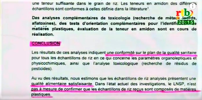 « Au vu des résultats, nous estimons que les échantillons de riz analysés présentent une qualité alimentaire satisfaisante. Dans l’état actuel des investigations, le LNSP n’est pas à mesure de confirmer que les échantillons de riz reçus sont composés de matières plastiques ». C’est la conclusion du rapport du LNSP sur les échantillons de riz soumis à son analyse et que la RTB Télé a rendue publique ce 24 mai 2017.