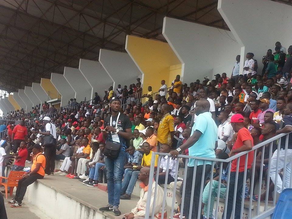 Le Stade Robert Champroux de Marcory est plein une heure avant le match.  Des supporters attendent encore d’accéder au stade de 30 000 places.