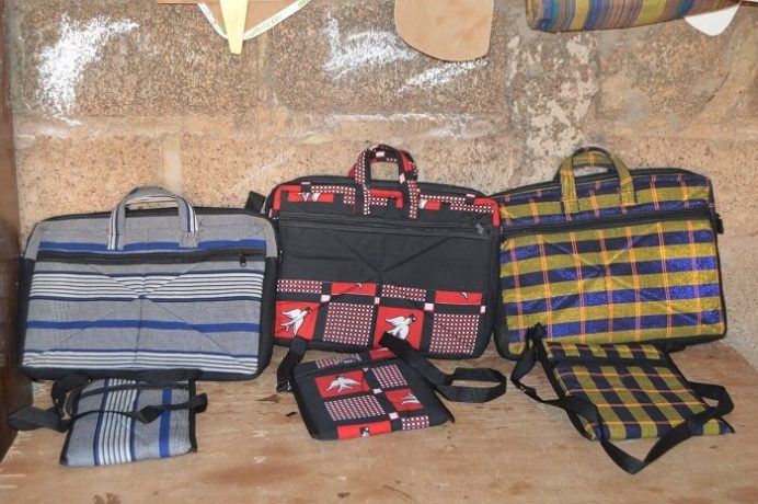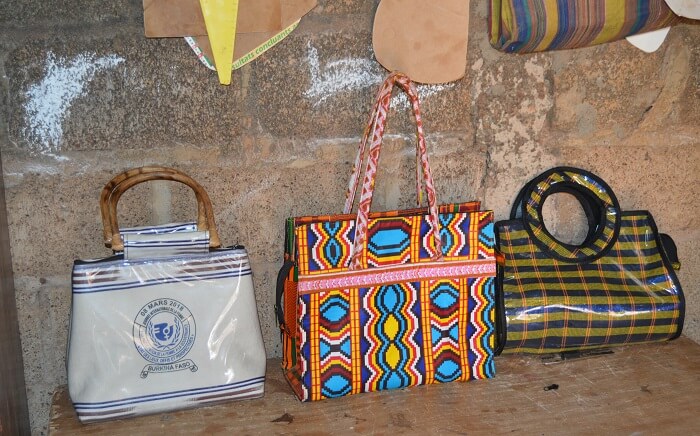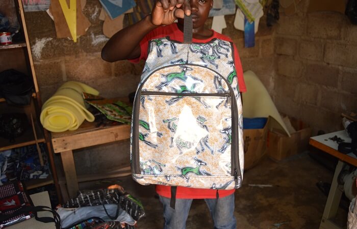 Georges Sougué (GS) : Le  projet que j’ai lancé, c’est beaucoup plus la confection des sacs à base des pagnes des tenues scolaires.  Ce sont des sacs à dos confectionnés avec les tenues scolaires et recouverts d’un transparent pour la protection. Nous sommes dans un pays où il y a de la poussière. C’est pour permettre la durabilité du sac.