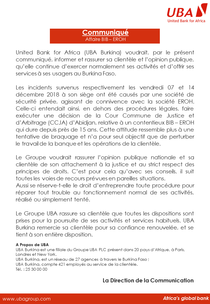 Accueil/Actualité/communiqués de presse/Affaire BIB-EROH : UBA Burkina communique Affaire BIB-EROH : UBA Burkina communique Rédaction B24 Envoyer un courriel 14/12/20180 Moins d’une minute [Vous pouvez télécharger aussi le communiqué cliquez ici ] Rédaction B24 Envoyer un courriel 14/12/20180 Moins d’une minute Linkedin Messenger Messenger WhatsApp Telegram Partager par email Imprimer