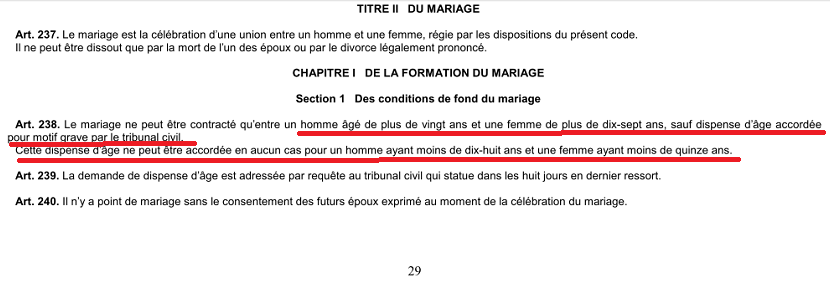 Le fait le plus intriguant se trouve à un autre niveau d’interprétation desdits textes. En fait, le Code des personnes et de la famille, en l’état actuel, « autorise » le mariage d’enfants, car il permet le mariage des filles à partir de 17 ans. Il peut, de surcroît, y avoir une dispense d’âge en cas de motif grave, généralement en cas de grossesse (NB : le motif grave dépend de l’appréciation du Juge).