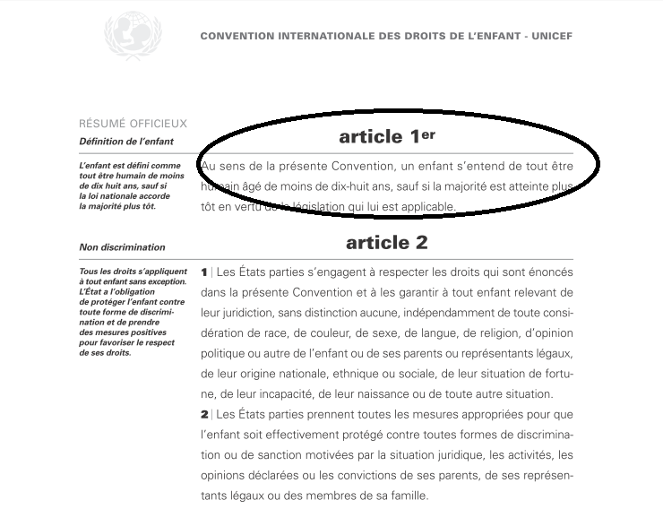 Il est indiqué qu’« au sens de la présente Convention, un enfant s’entend de tout être humain âgé de moins de dix-huit ans, sauf si la majorité est atteinte plus tôt en vertu de la législation qui lui est applicable ».