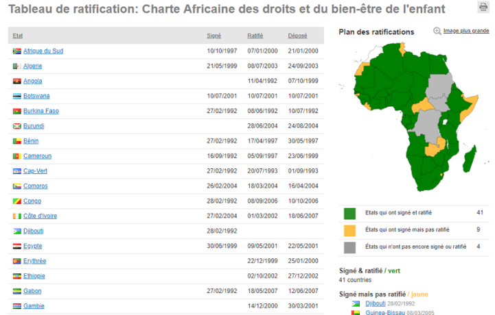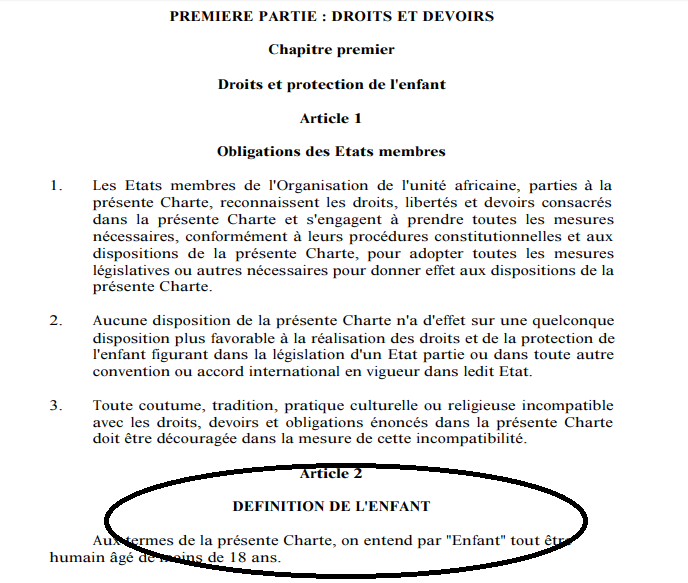 Le « Pays des Hommes intègres », comme plusieurs autres pays d’Afrique, a également ratifié la Charte africaine des droits et du bien-être de l’enfant le 8 juin 1992. Dans cette Charte adoptée en juillet 1990 et entrée en vigueur en novembre 1999, il est également mentionné clairement : « On entend par ‘Enfant’ tout être humain âgé de moins de 18 ans ».