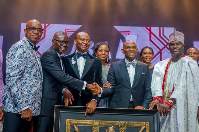 G-D: M. Victor Osadolor, DG de UBA Africa ; M. Kennedy Uzoka, DG du groupe UBA ; M. Dapo Abiodun, Gouverneur élu de l’État d’Ogun ; M. Babajide Sanwo-olu, Gouverneur élu de l’État de Lagos ; Tony Elumelu, Président du Groupe UBA ; Alhaji Abdul Rahman Abdulrasaq, Gouverneur élu de l’État de Kwara ; Dr Awele Elumelu, Épouse du président du groupe UBA ; Mme Onari Duke, Administratrice du Groupe UBA ; Aremo Olusegun Osoba, ancien Gouverneur de l’État d’Ogun ; Erelu Angela Adebayo, Administratrice du Groupe UBA ; Prof. Ben Ayade, Gouverneur de l’État de Cross River ; Oba Adeyeye Ogunwusi, Roi Ooni d’Ife; Alhaji Shehu Muhammad, représentant de l’Émir de Kano et Sarikin Shanub de Kano ; lors de la soirée spéciale « UBA CEO Awards » pour marquer le 70e anniversaire de la banque à Lagos le 27 avril.
