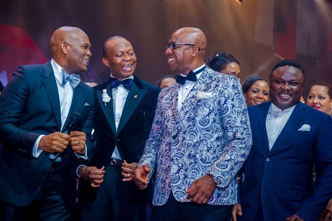 G-D: le Président du Groupe UBA, M. Tony Elumelu ; le DG du Groupe, M. Kennedy Uzoka ; le Gouverneur élu de l’État d’Ogun, M. Dapo Abiodun ; le Gouverneur de l’État de Cross River, Prof. Ben Ayade, lors de la soirée spéciale ‘UBA CEO Awards’, marquant le 70e anniversaire de la banque à Lagos le 27 avril.
