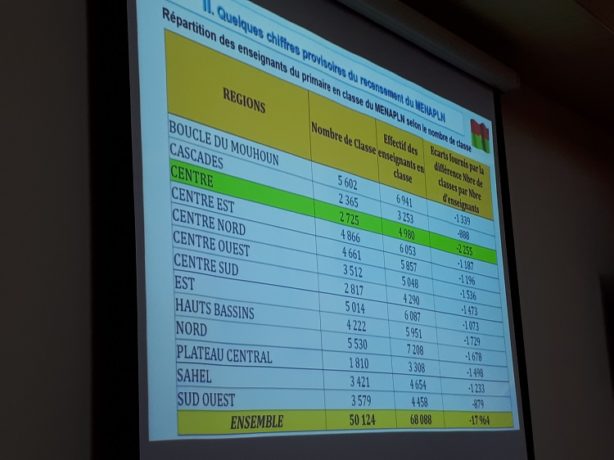 Le professeur agrégé de mathématiques s’est appuyé sur les données collectées dans le cadre d’un recensement géographique du personnel et de description des postes de travail avant la phase redéploiement du personnel du ministère. A l’issue de la collecte des données, au niveau du formel, l’on dénombre au préscolaire 928 enseignants pour 461 salles de classe et au primaire 68 088 enseignants pour 50 124 salles de classe. Quant au niveau du non formel les effectifs font état de 942 formateurs pour 554 centres de formation pour adolescents et 5 680 formateurs pour 3 094 centres pour adultes.