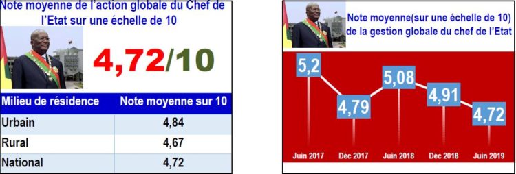 Noté 4,91/10 en décembre 2018, le chef de l’Etat obtient pour le premier semestre de 2019 la note de 4,72/10 soit une baisse de 0,21 point.