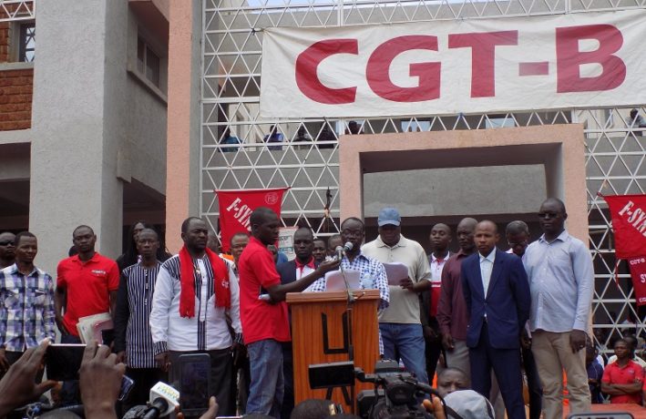11h. Les forces de sécurité repoussent les manifestants jusqu’à la Bourse du travail. Elles occupent les alentours de la maison commune. Les protestataires les contournent comme ils peuvent et se retrouvent pour le meeting et le mot de fin. « Djiiiibo, Djiiiibo, Djiiiibo,… », scandent-ils. C’est le secrétaire général adjoint de la CGT-B, Robert Wangré, qui livre le message de l’Unité d’action populaire.
