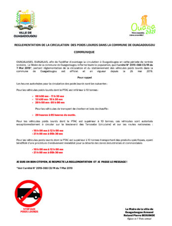 Accueil/Actualité/communiqués de presse/Règlementation de la circulation des poids lourds dans la commune de Ouagadougou Règlementation de la circulation des poids lourds dans la commune de Ouagadougou Rédaction B24 Envoyer un courriel 24/10/20190 Moins d’une minute Un camion à Ouagadougou / photo d'illustration Partage Rédaction B24 Envoyer un courriel 24/10/20190 Moins d’une minute Linkedin Messenger Messenger WhatsApp Telegram Partager par email Imprimer