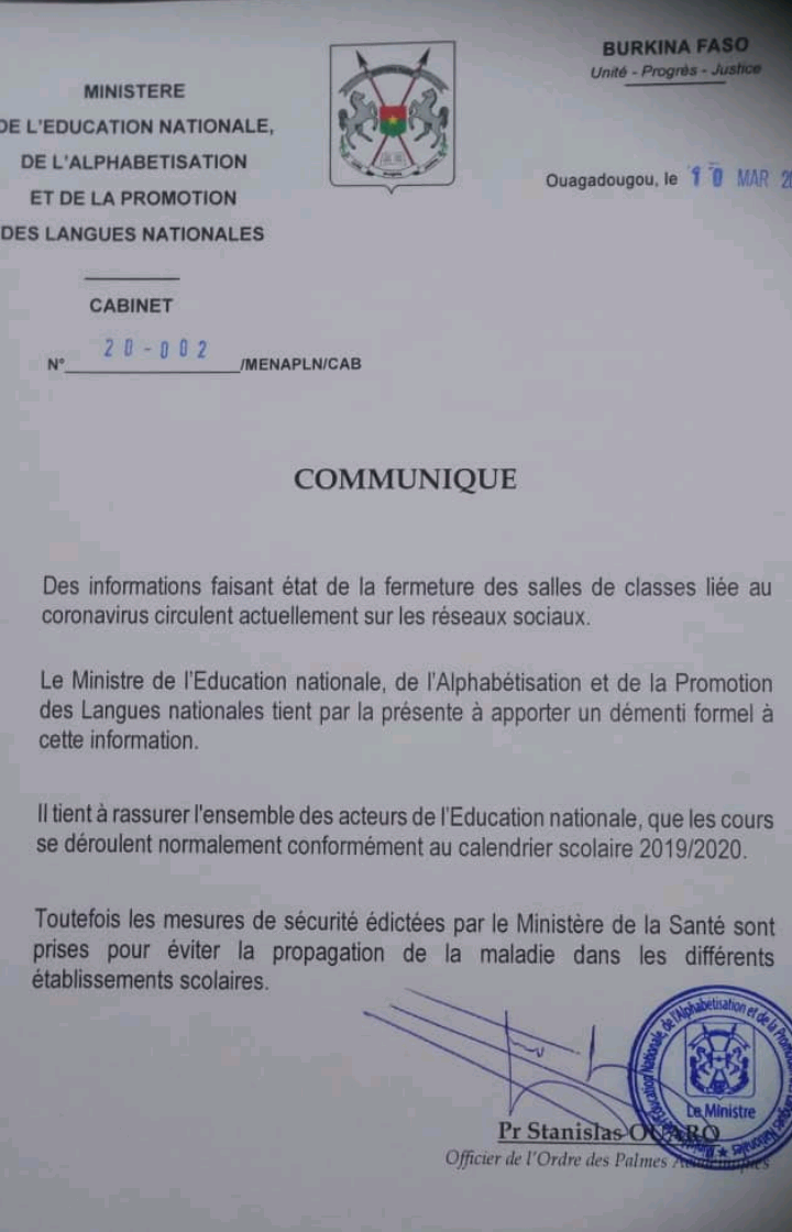 Le ministère burkinabè de l’éducation nationale a démenti ce 10 mars 2020 les rumeurs sur la fermeture des salles de classes pour cause de Coronavirus.