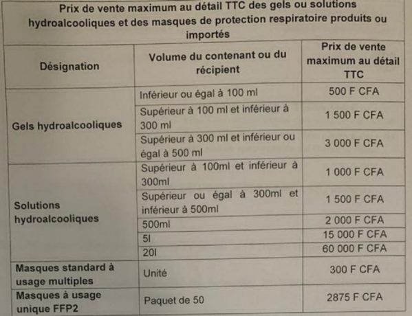 Ces prix vont de 500 F CFA à 3 000 F CFA en fonction du volume du contenant pour les gels hydroalcooliques et de 1 000 F CFA à 60 000 F CFA pour les solutions hydroalcooliques (voir tableau en fin d’article).