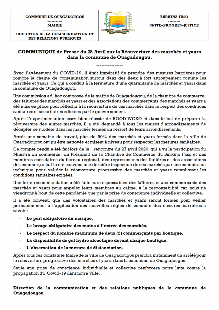 Accueil/Actualité/communiqués de presse/Communiqué de la mairie de Ouagadougou sur la réouverture des marchés et yaars Communiqué de la mairie de Ouagadougou sur la réouverture des marchés et yaars Webmaster B24 Envoyer un courriel 29/04/20200 Moins d’une minute Partage 👉🏽 Pour télécharger le communiqué, cliquez ici: Communique reouverture des marchés corrigé Webmaster B24 Envoyer un courriel 29/04/20200 Moins d’une minute Linkedin Messenger Messenger WhatsApp Telegram Partager par email Imprimer