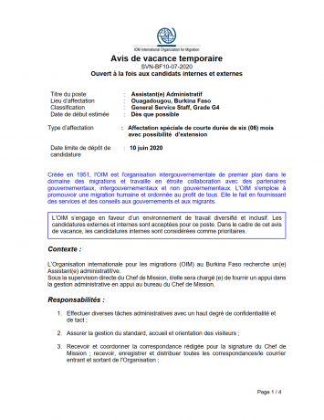 Offre d’emploi: Assistant(e) Administratif – Ouagadougou, Burkina Faso (OIM)