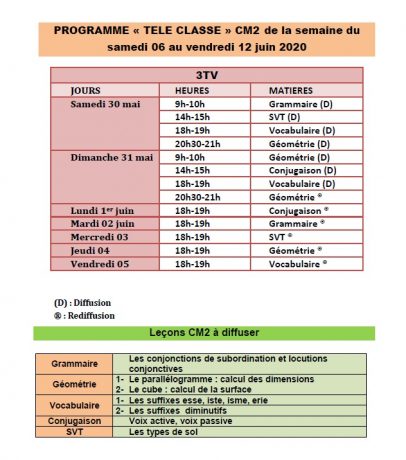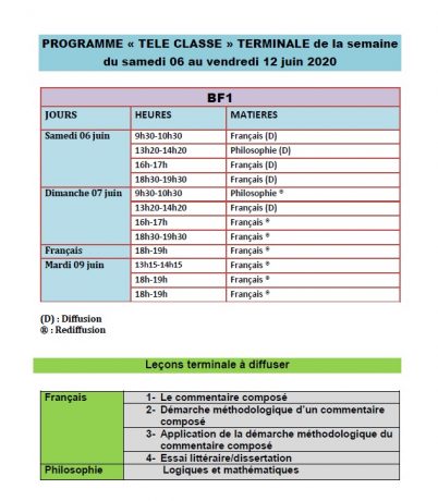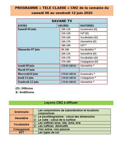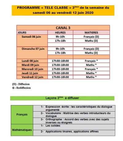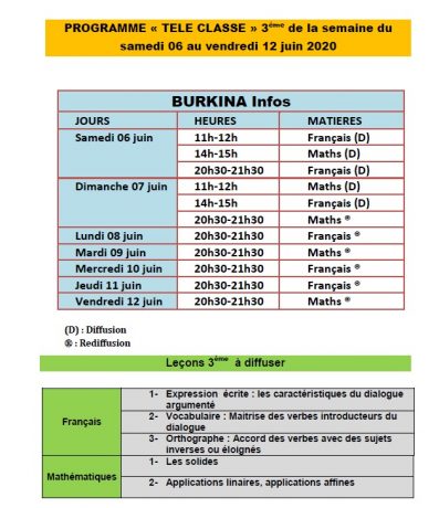 Accueil/Actualité/Burkina/Communiqués du MENA: Votre programme « TELE CLASSE » de la semaine du samedi 06 au vendredi 12 juin 2020. A suivre sur la RTB, 3TV, Savane TV pour le CM2, Canal 3, Oméga TV, Burkina Infos pour la 3ème et LCA, BF1 pour le programme de la terminale. Communiqués du MENA: Votre programme « TELE CLASSE » de la semaine du samedi 06 au vendredi 12 juin 2020. A suivre sur la RTB, 3TV, Savane TV pour le CM2, Canal 3, Oméga TV, Burkina Infos pour la 3ème et LCA, BF1 pour le programme de la terminale. Webmaster B24 Envoyer un courriel 05/06/20200 Moins d’une minute Partage Webmaster B24 Envoyer un courriel 05/06/20200 Moins d’une minute Linkedin Messenger Messenger WhatsApp Telegram Partager par email Imprimer