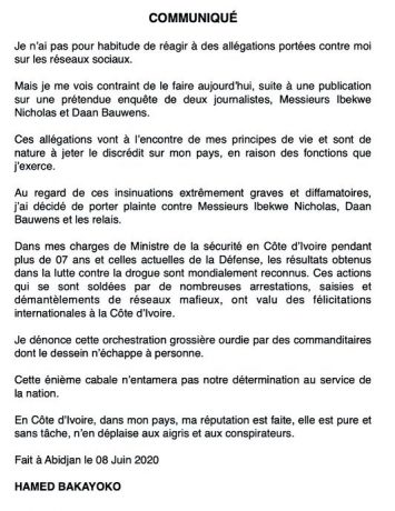 La “prétendue enquête de deux journalistes” va “à l’encontre de mes principes de vie et sont de nature à jeter le discrédit sur mon pays (…). Au regard de ces insinuations extrêmement graves et diffamatoires, j’ai décidé de porter plainte”, a fait savoir dans un communiqué disponible sur les réseaux sociaux l’homme en charge de la défense nationale ivoirienne lourdement accusé par les deux journalistes d’investigations de renom le Nigérian Nicholas Ibekwe et le Belge Daan Bauwens.