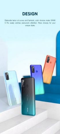 Avec le thème sombre, le téléphone donne également aux utilisateurs plus de temps de batterie et réduit l’émission de lumière bleue, réduisant la fatigue oculaire. SPARK 5 est disponible en 4 options de couleurs ( Glace jadéite, Orange Spark, Bleu Vacation et en gris brumeux). La finition, le matériau et le look étincelant de l’appareil le rend unique et beau. Le Spark 5 est également fait de polycarbonate (matériau vitreux) similaire au Camon 12 lui donnant une sensation de luxe et d’élégance.