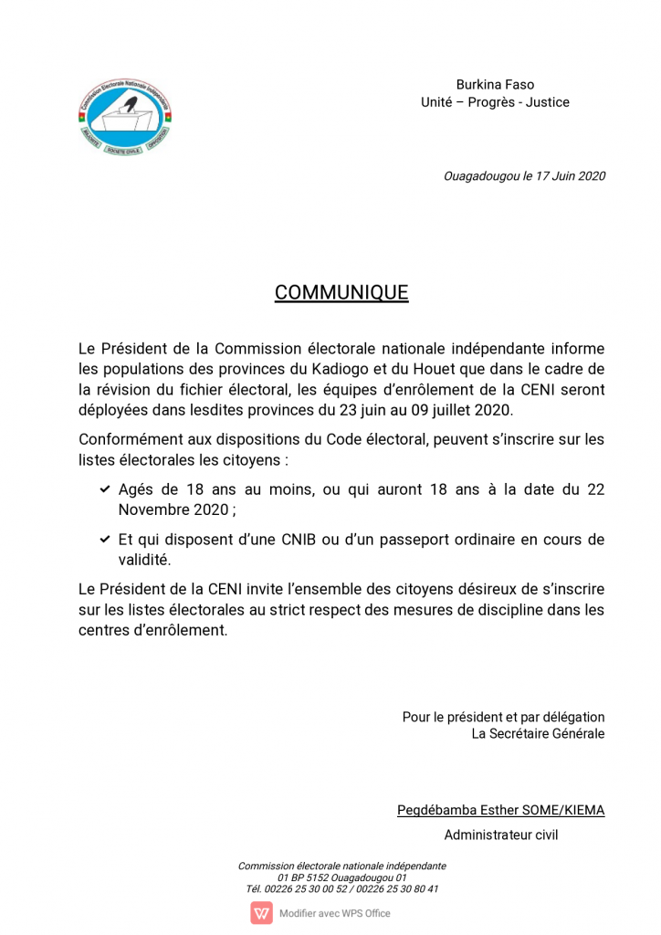 Le Président de la CENI informe les populations des provinces du Kadiogo et du Houet que ses équipes d’enrôlement seront déployées dans lesdites provinces du 23 juin au 09 juillet 2020