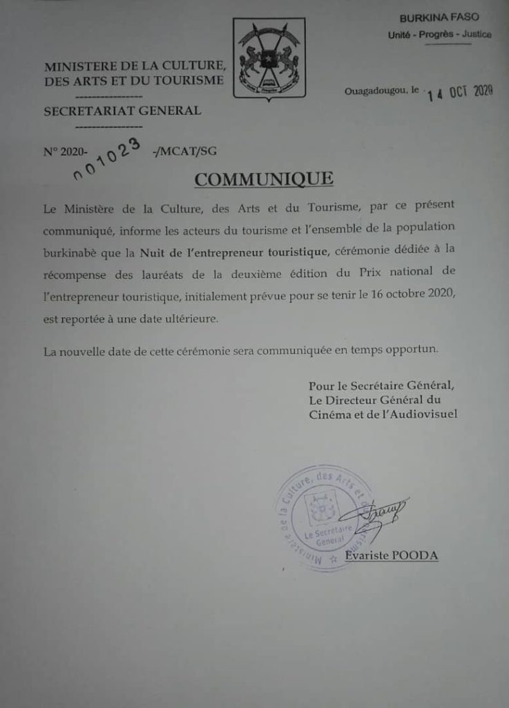 Accueil/Actualité/communiqués de presse/Communiqué du Ministère des Arts et du Tourisme Communiqué du Ministère des Arts et du Tourisme Webmaster B24 Envoyer un courriel 14/10/20200 Moins d’une minute Webmaster B24 Envoyer un courriel 14/10/20200 Moins d’une minute Linkedin Messenger Messenger WhatsApp Telegram Partager par email Imprimer