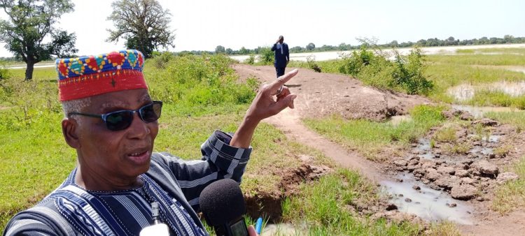 « C’était le 13 juin 2018, après une forte pluie que la digue du barrage a connu ce problème. Comme le barrage s’étend sur plusieurs centaines de mètres, l’eau est venue en puissance et une partie de la digue est partie. Ce matin, nous nous sommes mobilisés, ainsi que les femmes, pour la réhabilitation de cette digue qui est en train de céder. Nous sommes composés essentiellement de maraîchers, de jardiniers. Nous avons cotisé pour payer des sacs vides qu’on remplit avec du sable pour essayer de maintenir la digue », explique-t-il.